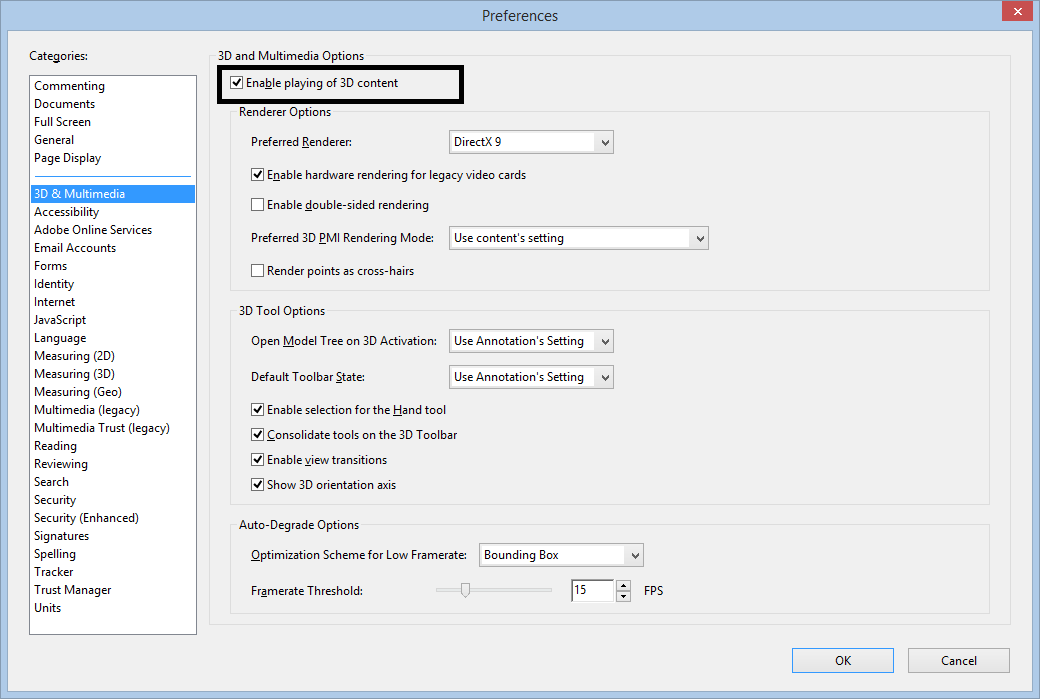 - Go to Edit > Preferences > 3D & Multimedia and then select the Enable playing 3D content checkbox.